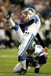 Jason’s pro career is highlighted by his 1,890 points; he’s also the all-time leader in field goals (439) and extra points(573). He was voted team captain for four straight years. Hanson ranks first in Lions history in every statistical category for a place kicker, and was honored as Lions’ 2006 MVP by the Detroit Lions Quarterback club. Hanson is only the 6th player in NFL history to connect on 400 career field goals and set